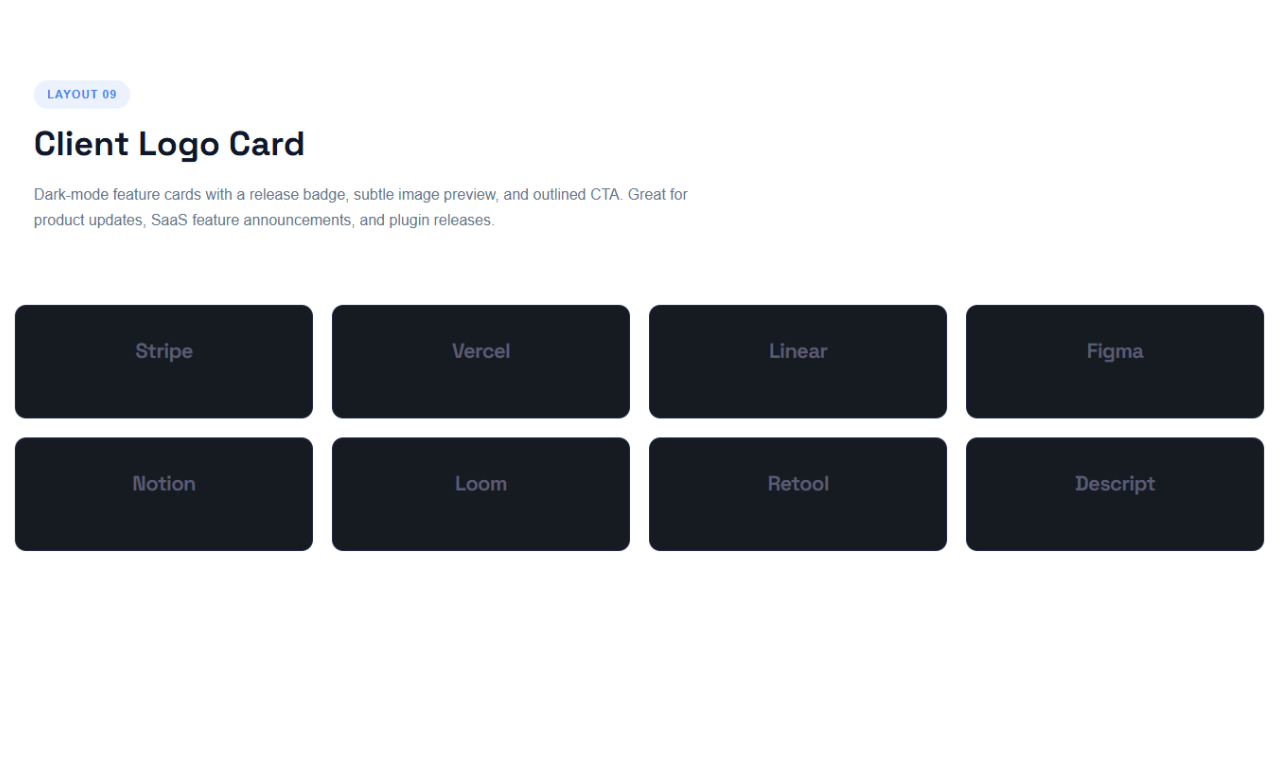 Client Logo Card: Professionally present brand partners with specialized minimal typographic cards and distinct hover color interactions.