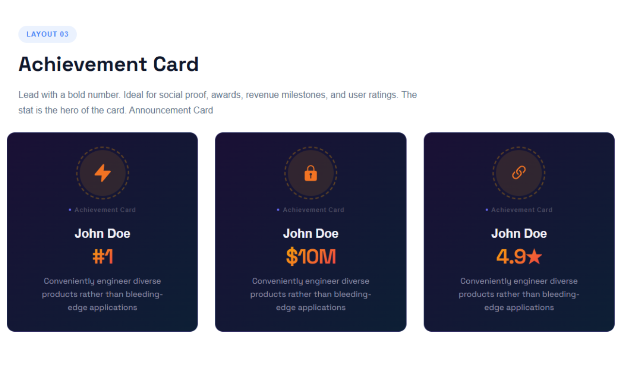 Achievement Card: Highlight your biggest wins with a large central metric and a customizable spinning SVG badge animation.