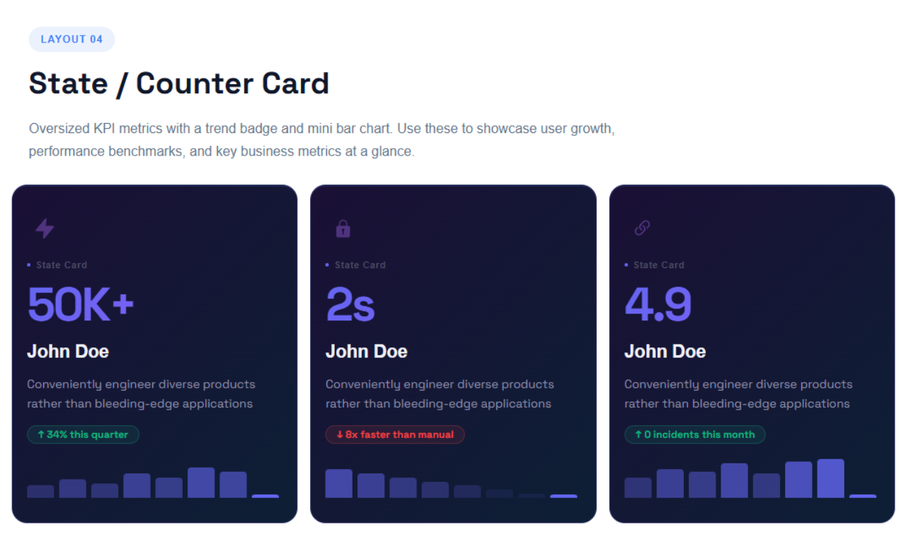 State / Counter Card: Create dynamic statistic cards featuring up/down trend ribbons and customizable visual sparkline graphs.