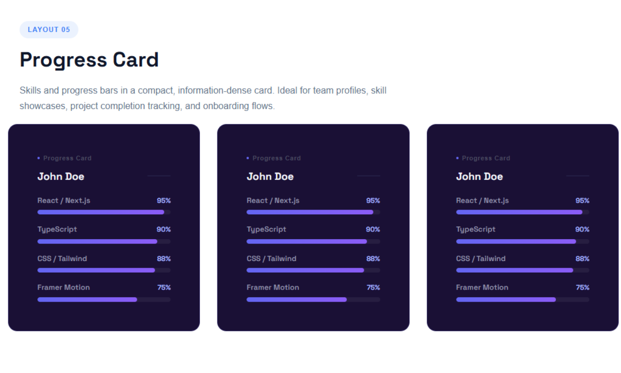 Progress Card: Display skill levels or project progress with customizable gradient bars and individual metric tracking.