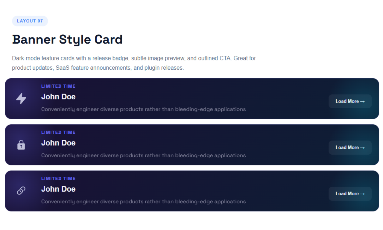 Banner Card: Build full-width promotional banners featuring stunning « Glassmorphism » blur effects and custom eyebrow taglines.